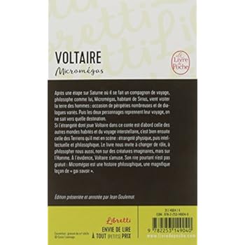Après une étape sur Saturne où il se fait un compagnon de voyage, philosophe comme lui, Micromégas, habitant de Sirius, vient visiter la terre des hommes, « notre petite fourmilière » : occasion de péripéties nombreuses et de dialogues variés. Puis, à la fin du livre, les deux personnages reprennent leur voyage, on ne sait vers quelle destination. Le lecteur ne les accompagne plus.Il demeure aux côtés des Terriens, ses semblables.Si l'étrangeté dont joue Voltaire dans ce conte qu'il publie en 1752 est d'abord celle des deux voyageurs, des autres mondes habités et du voyage interstellaire, c'est bien ensuite celle des Terriens qu'il met en scène : étrangeté physique, puis intellectuelle et philosophique. Le livre ainsi nous invite à changer de rôle, à philosopher nous aussi, non sur des créatures imaginaires, mais au contraire sur l'Homme. A l'évidence, Voltaire s'amuse. Son rire pourtant n'est pas gratuit : Micromégas est une histoire philosophique, une magniÞque leçon de « gai savoir ».Edition présentée et annotée par Jean Goulemot.
